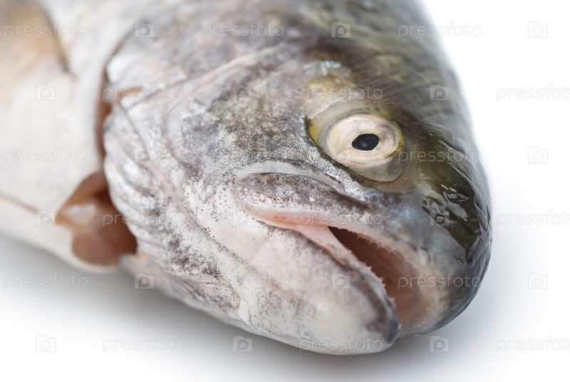 Голова свежей рыбы крупным планом на белом фоне