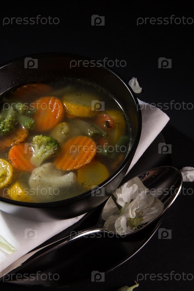 Овощной суп в черной тарелке