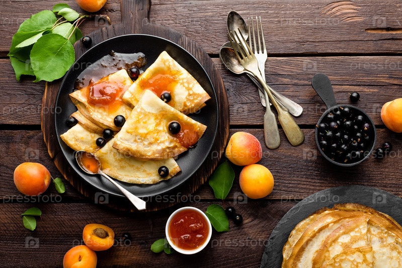 Блины со свежей черной смородиной и абрикосовым вареньем