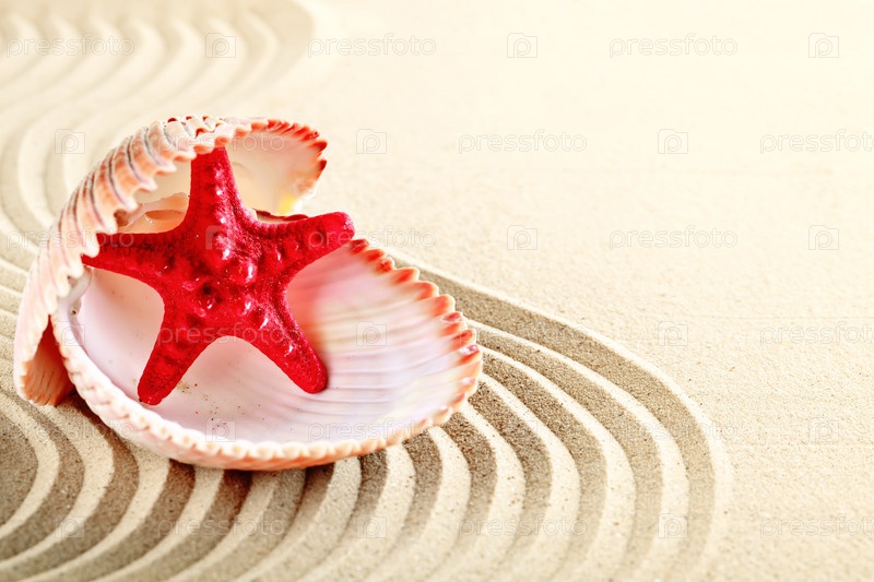 Морская звезда и ракушки на пляже