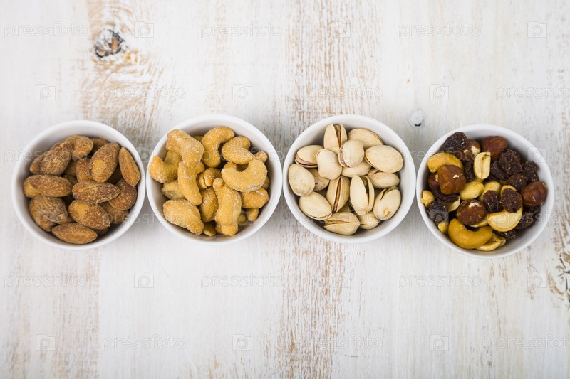 Четыре чаши с орехами на деревянном столе