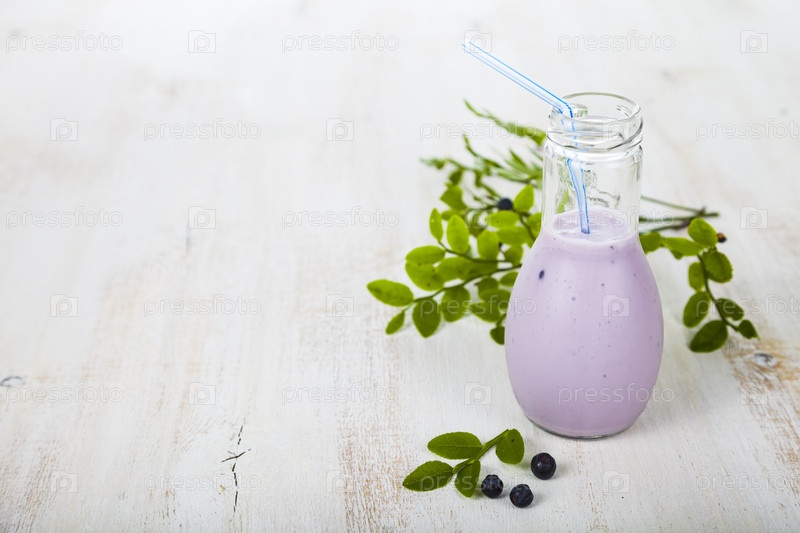 Спелая черника и молочный коктейль на деревянном столе
