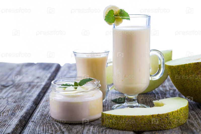 Йогурт и пюре с дыней на деревянном столе
