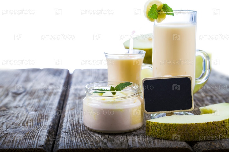 Йогурт и пюре с дыней на деревянном столе