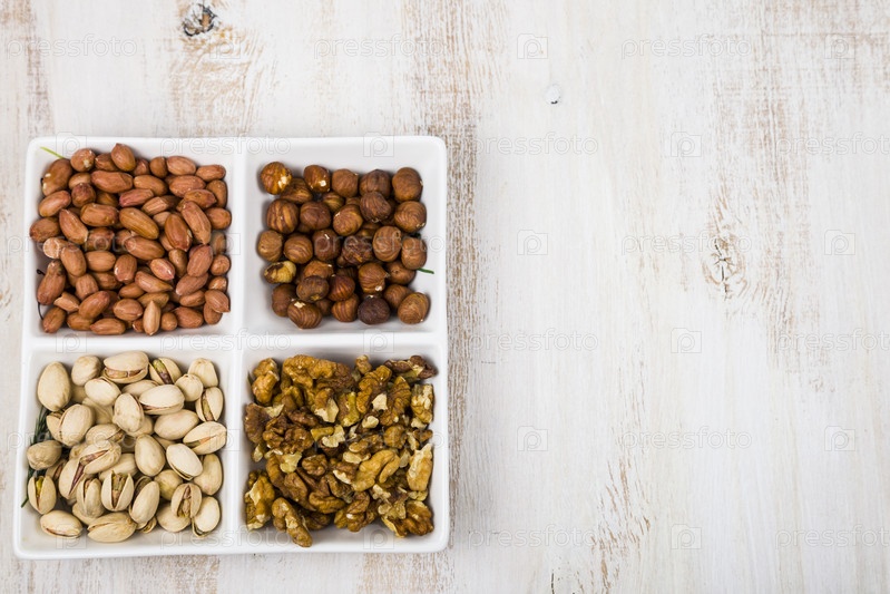 Чаша с орехами на деревянном столе