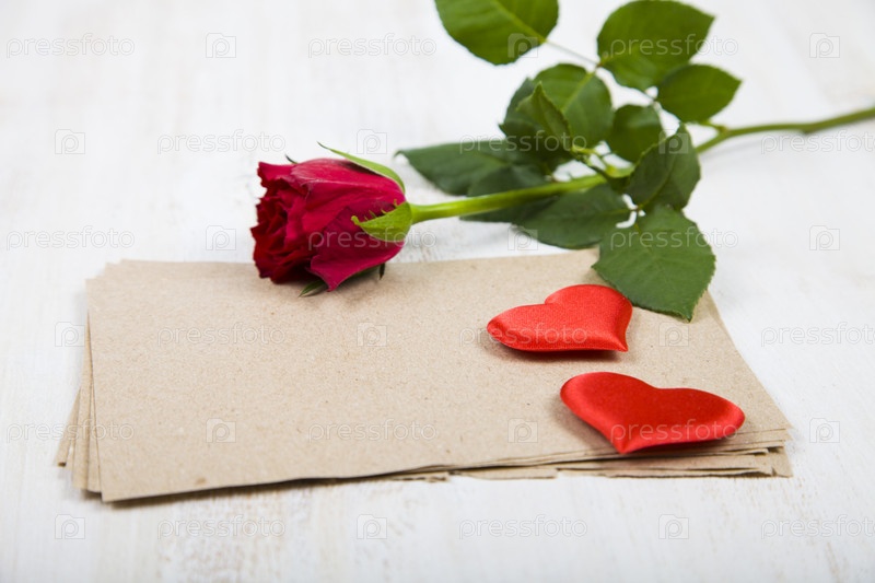 Красная роза, сердечки и бумага для поздравлений