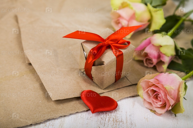 Розовые розы, подарок и сердца
