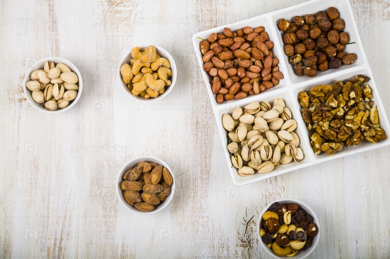 Чаши с орехами на деревянном столе