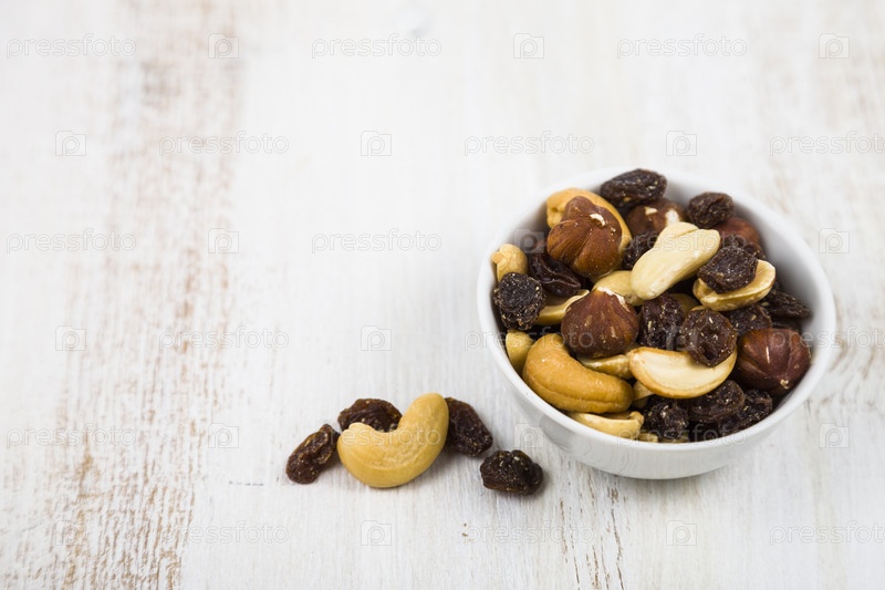 Смешение орехов и сухофруктов на деревянном столе