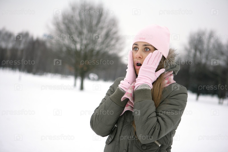 Испуганная девушка на прогулке, зимой