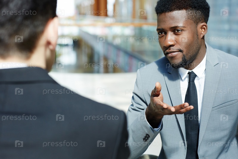 Красивый африканский бизнесмен, обсуждающий работу с партнерами