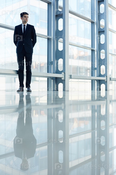 Бизнес-профессионал, стоящий в современном стеклянном зале