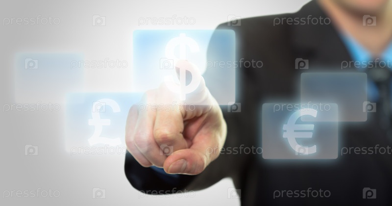 Рука бизнесмена нажимает виртуальную кнопку со знаком доллара