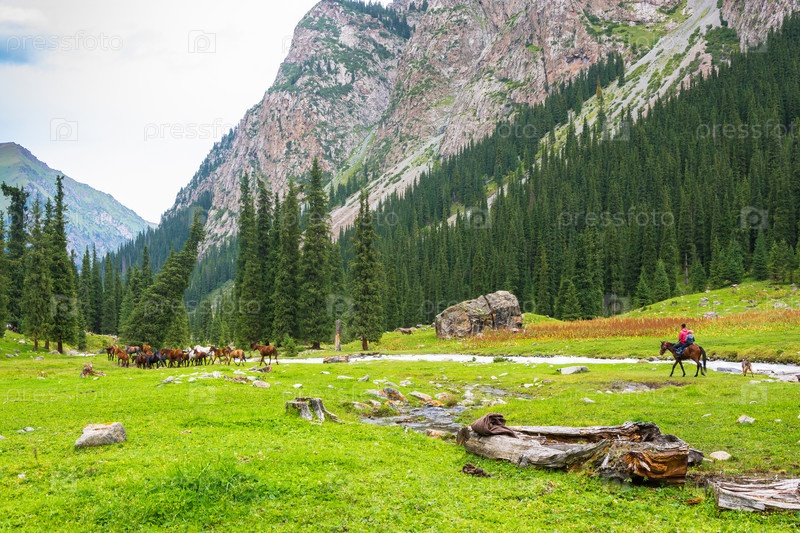 Горный пейзаж с лошадьми и рекой, Кыргызстан