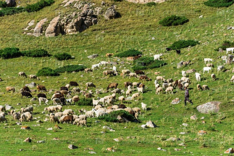 Большое стадо овец на склоне холма, Кыргызстан