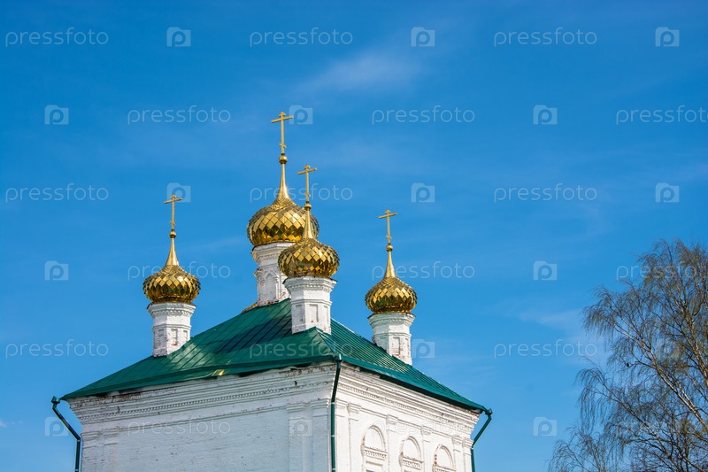 Золотые церковные купола на фоне голубого неба