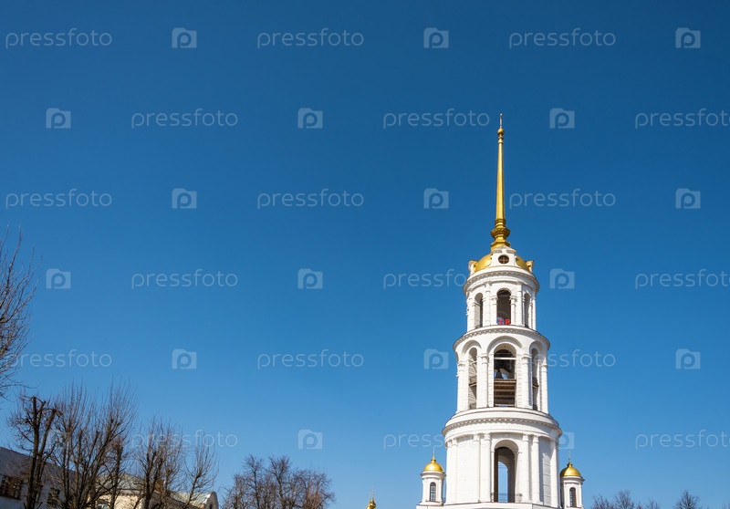 Высокая белая колокольня в Шуе Ивановской области, Россия
