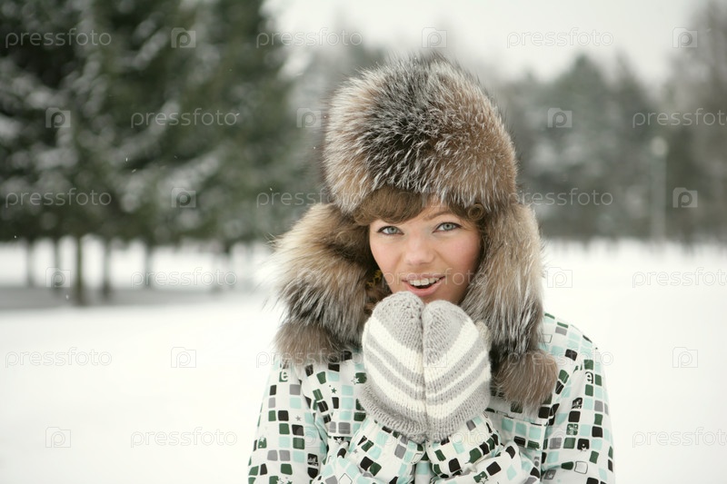 Девушка в мохнатой шапке на прогулке зимой