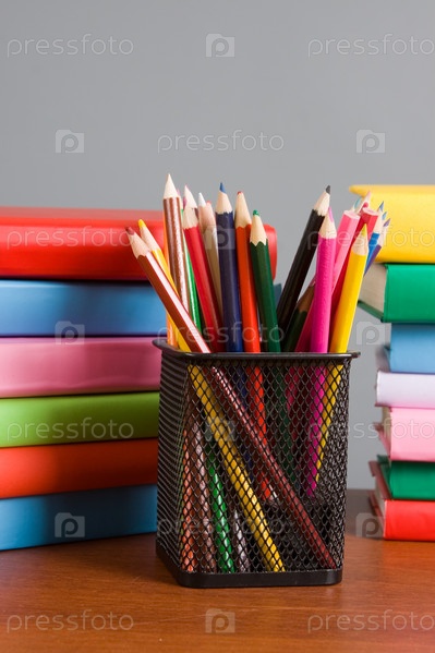 Цветные карандаши и стопка ярких книг на столе