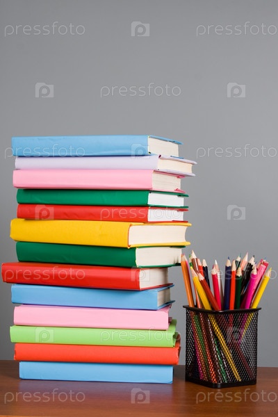 Цветные карандаши и стопка ярких книг на столе