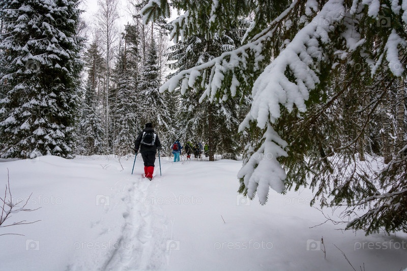 Небольшая группа туристов в зимнем лесу