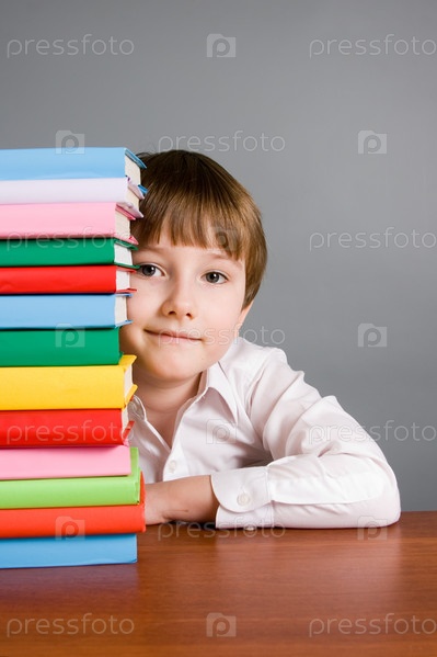 Мальчик смотрит из-за стопки книг на сером фоне