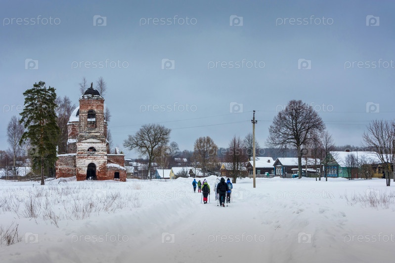Группа туристов в деревнюе в зимний день