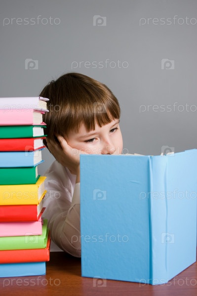 Мальчик читает книгу, сидя за столом