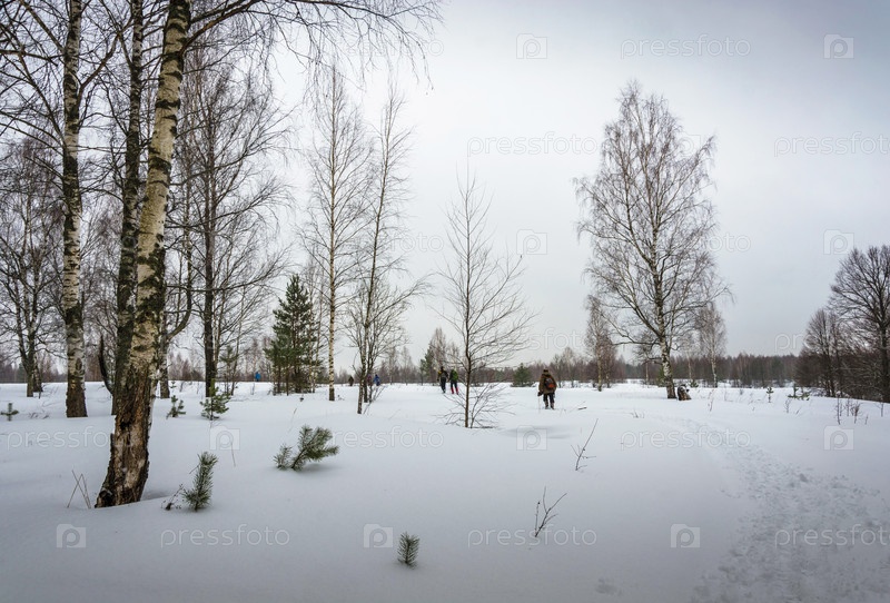 Небольшая группа туристов, путешествующих по заснеженному лесу