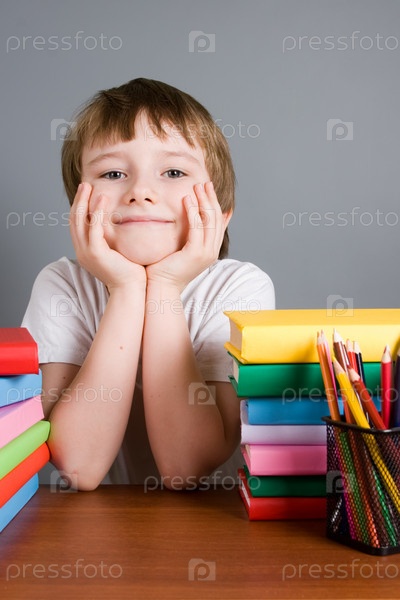 Мальчик с книгами на сером фоне