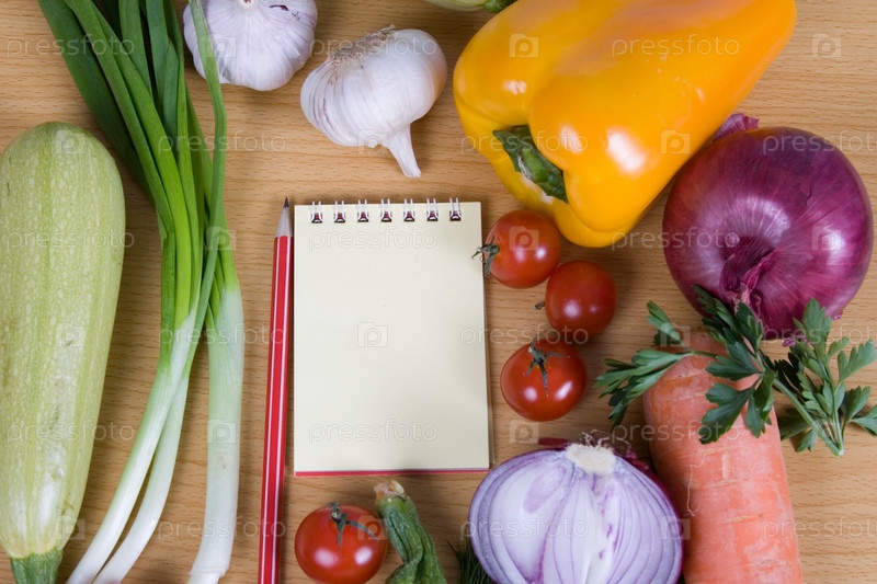 Свежие овощи и блокнот на столе