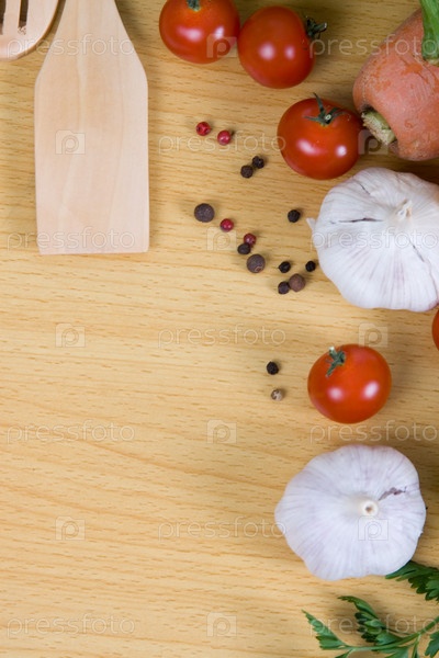 Свежие овощи и кухонная утварь на деревянном столе