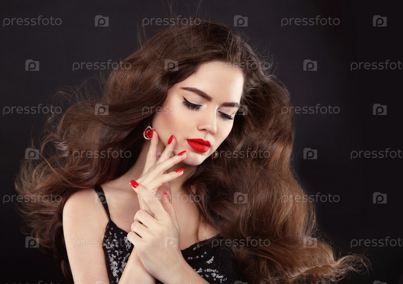 Красивая брюнетка с красным макияжем и маникюром