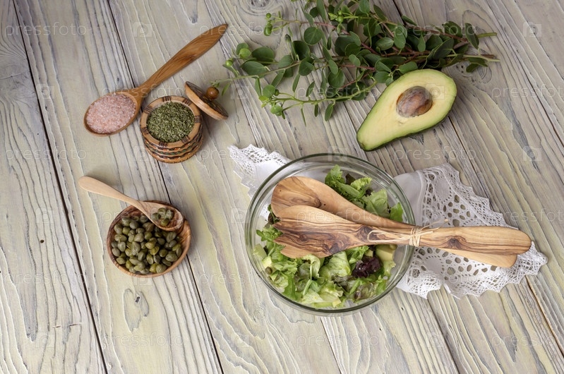 Салат из листьев салата, рукколы с авокадо и каперсов