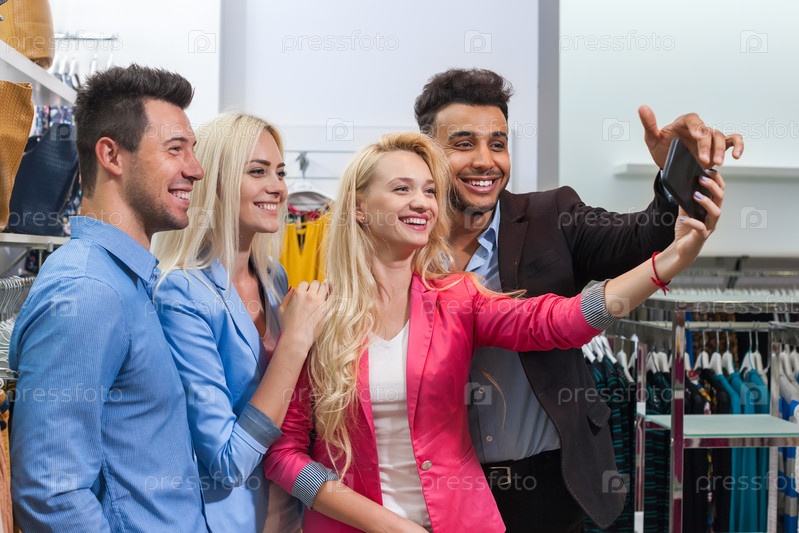 Счастливые улыбающиеся друзья, выбирающие одежду