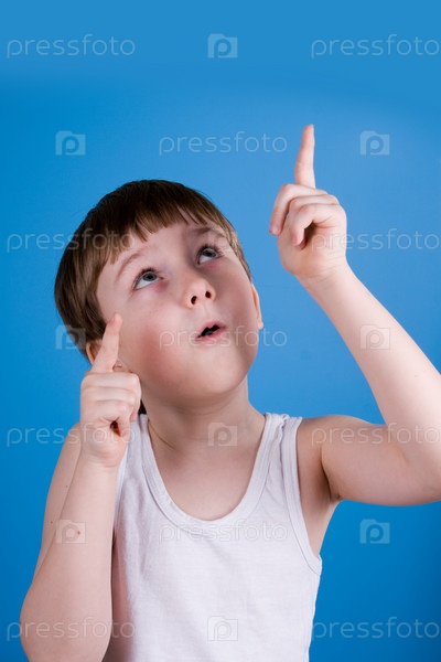 Эмоциональный мальчик в белой майке показывает вверх