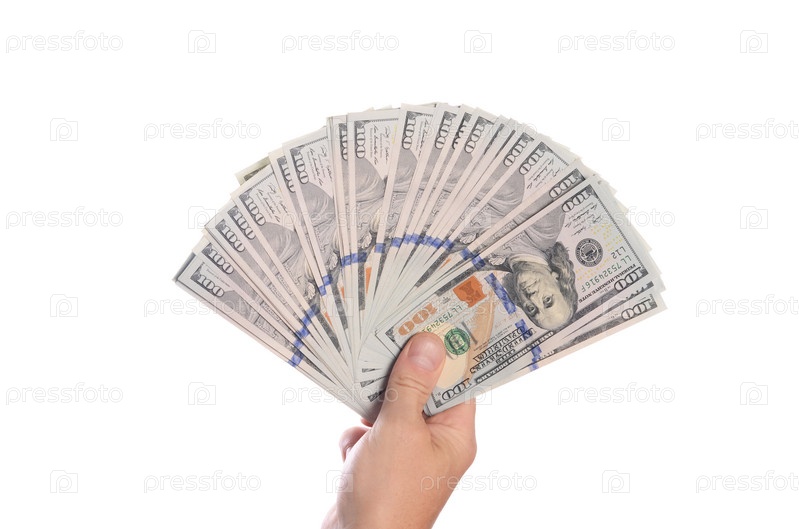 Доллары в руке человека на белом фоне