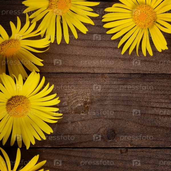 Желтые ромашки на деревянном фоне