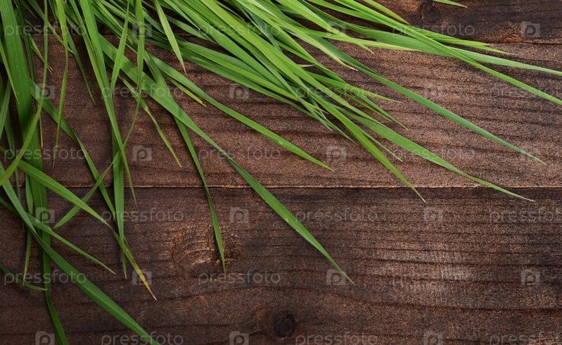 Зеленая трава на деревянном фоне