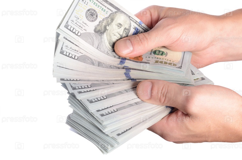 Доллары в руке человека на белом фоне