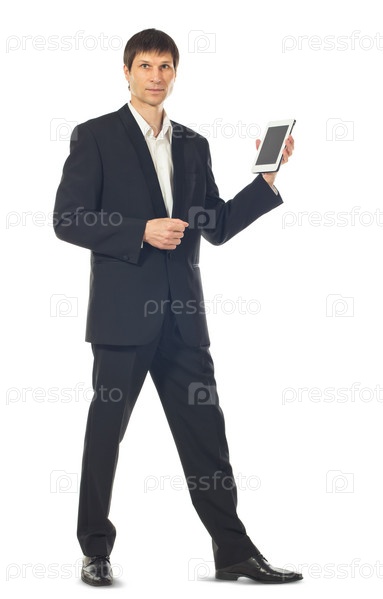 Молодой предприниматель с планшетным компьютером на белом фоне