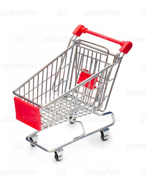 Пустая продуктовая тележка с небольшой тенью, изолированная на белом фоне