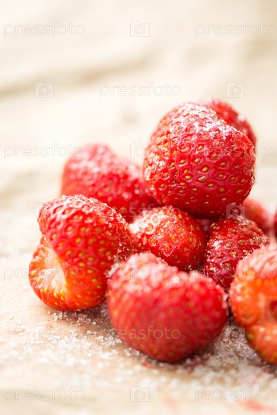 Клубника с сахаром на морщинистой коричневой бумаге