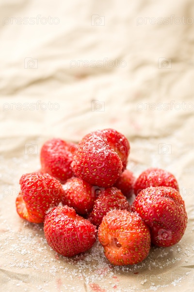 Клубника с сахаром на морщинистой коричневой бумаге