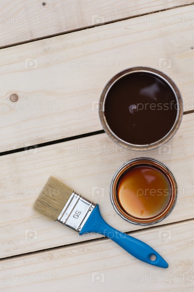 Кисть с ведром краски на столе