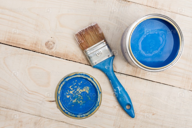 Банка с синей краской и кисть на деревянной доске