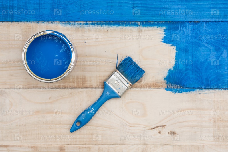 Банка с синей краской и кисть на деревянной доске