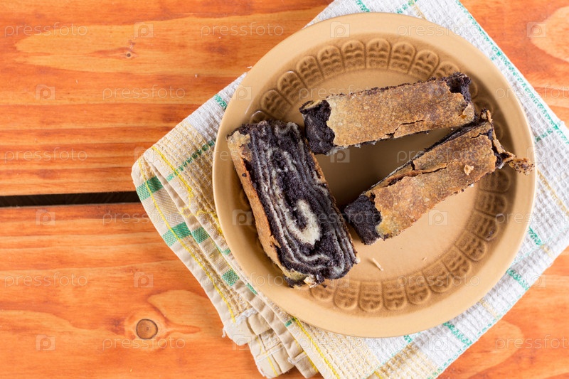 Маковый рулет ломтиками на деревянном фоне