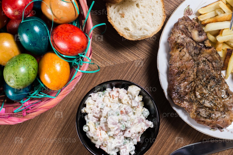 Обед на столе с мясом и пасхальными яйцами