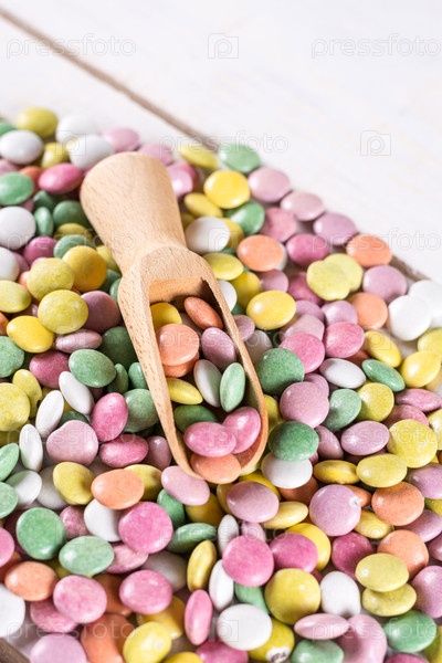 Деревянная мерная ложка в куче красочных круглых конфет